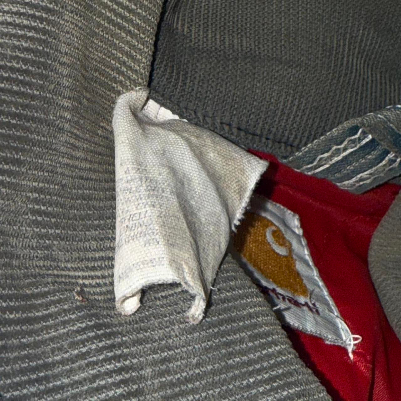 Vintage Carhartt Detroit jacket in washed denim with a red quilted lining and classic corduroy collar. Made from a slightly lighter-weight denim (not thick canvas), but still high quality and built to last. Faded tag with markings that align with authenticity.