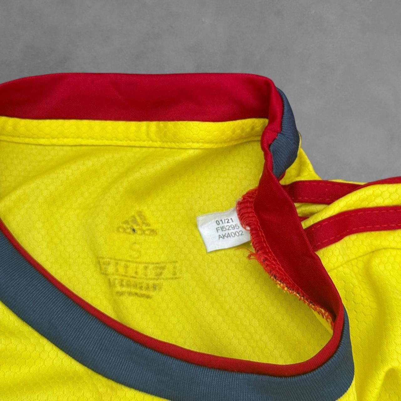 Bright yellow Climacool jersey with red Adidas logo, Colombia national team crest, red shoulder stripes, and navy/red trim on collar and cuffs. Lightweight, breathable fabric designed for performance and comfort.