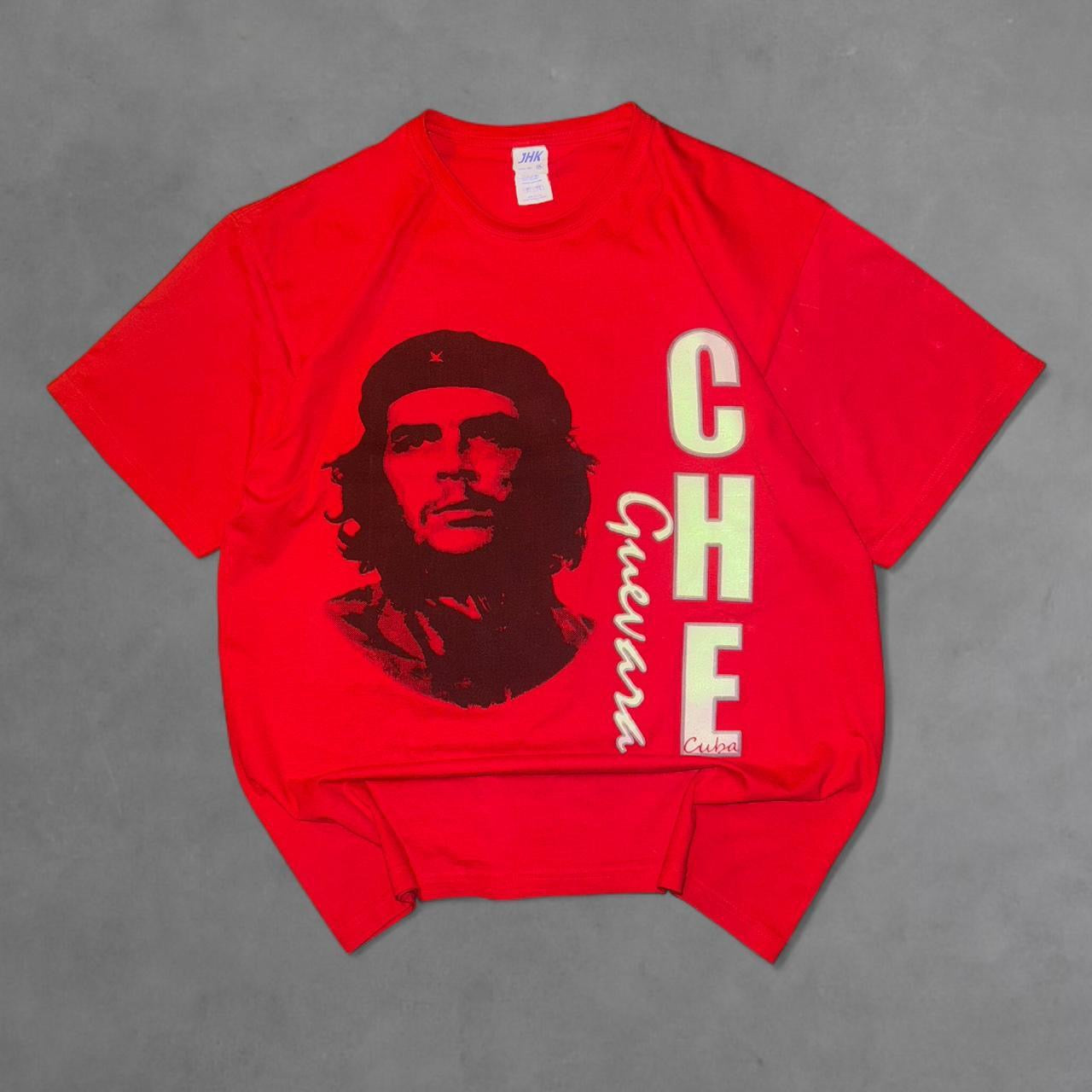 This rare vintage Che Guevara tee features a bold vertical “CHÉ” print alongside a striking portrait of the revolutionary icon. The vibrant red colorway and powerful graphic make it a standout piece for collectors and streetwear enthusiasts alike. Crafted from thick cotton with a classic boxy fit, it’s a true statement tee from the early 2000s.