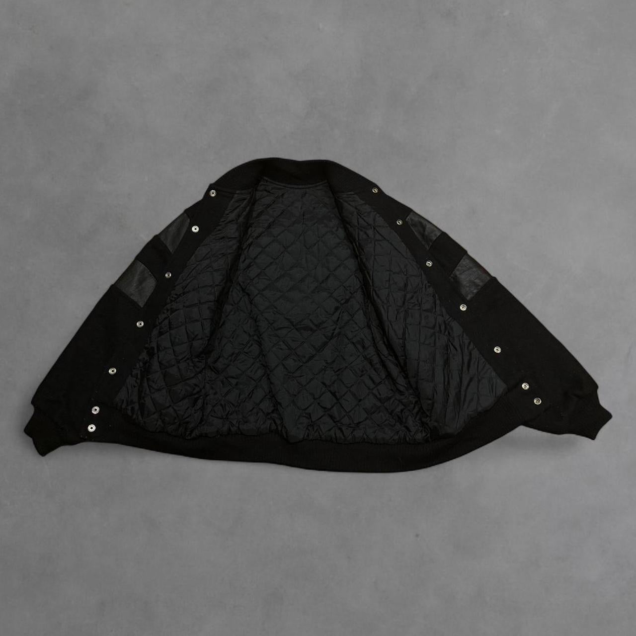 Classic black Gold Wing (Honda) varsity jacket featuring a wool body, genuine leather sleeves, and bold embroidery across the chest and full back. Quilted inner lining with a structured fit and premium vintage build. A true collector’s piece for fans of motorsport heritage and vintage Americana.