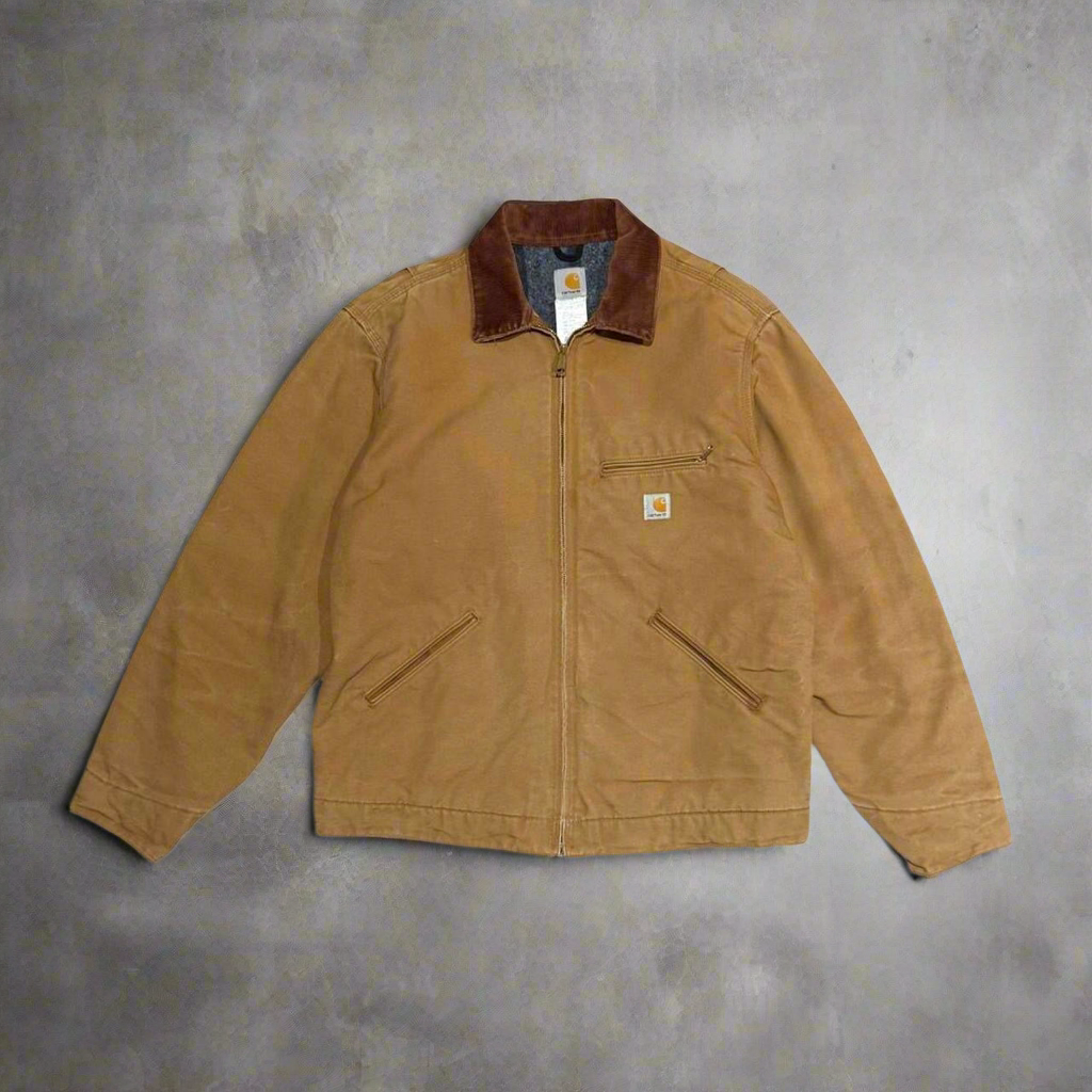 Iconic 1990s Carhartt Detroit Jacket in heavyweight duck canvas with blanket lining, corduroy collar, brass zipper, and classic patch. Made in USA with triple-stitched durability and perfect natural fade—this is top-tier vintage workwear and rare in this condition.